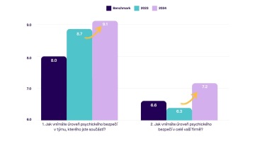 - psychologické bezpečí v mezitýmové spolupráci (z 6,3 na 7,2).